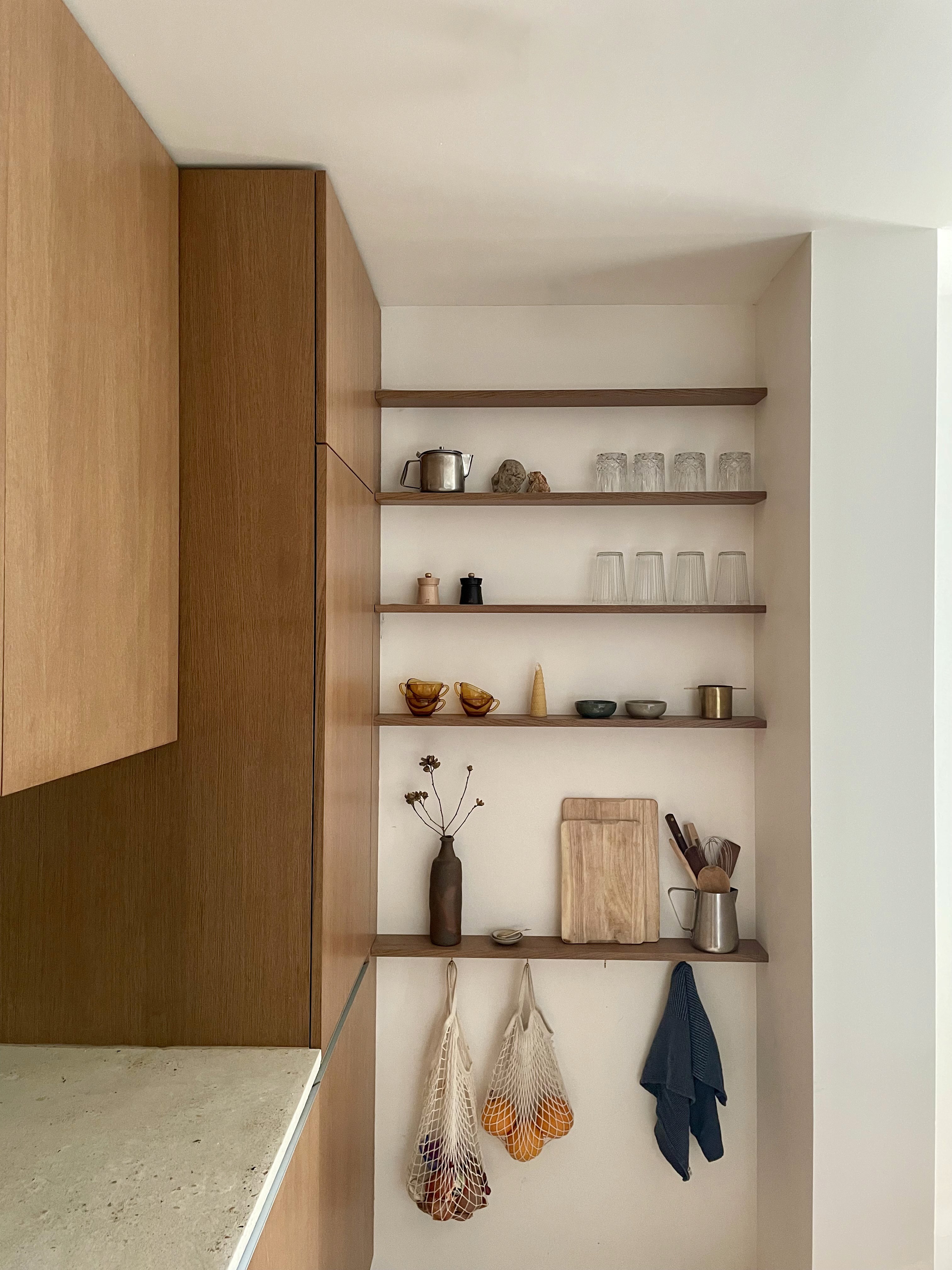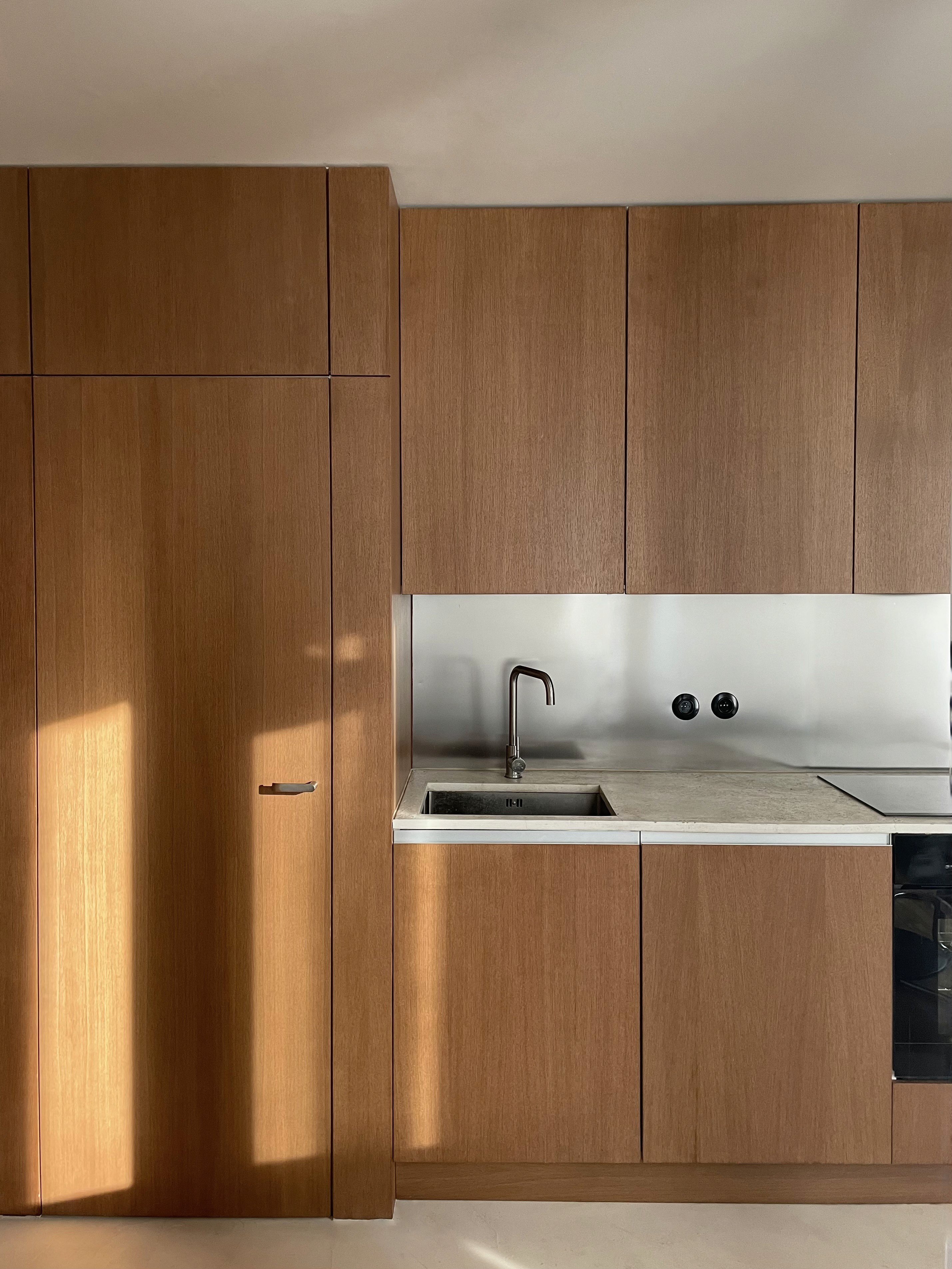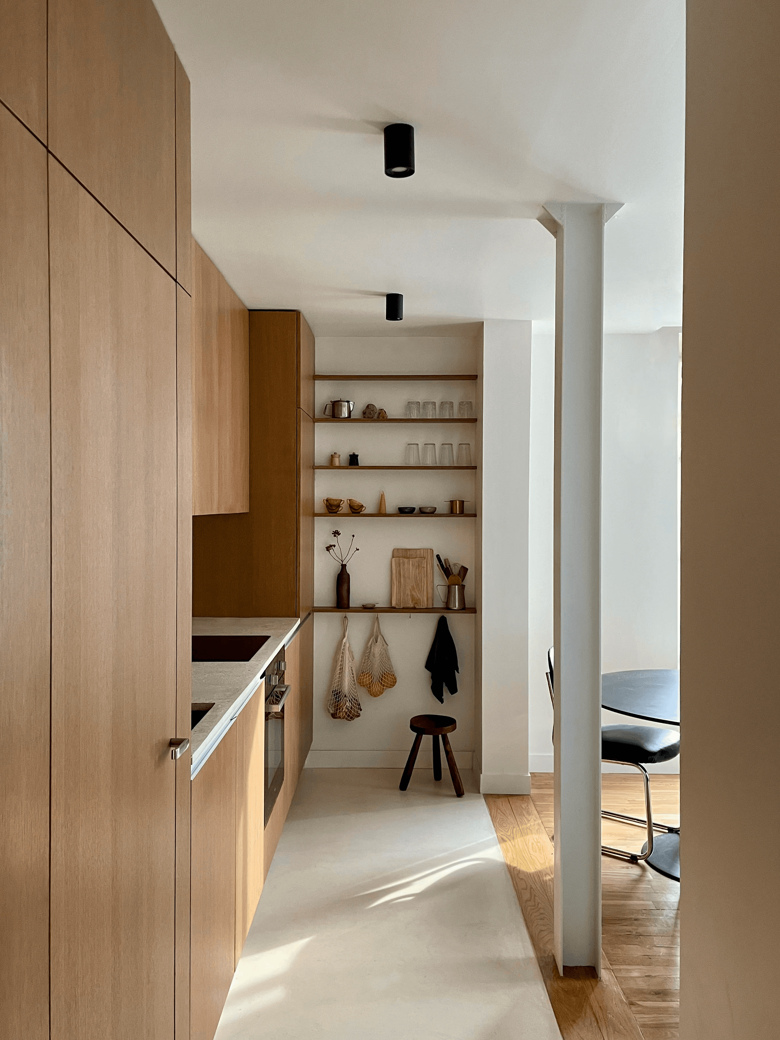 This renovation of an apartment located just outside Paris highlights a minimalist and decidedly contemporary aesthetic. The project focused on rethinking spatial volumes and optimizing functionality, while paying particular attention to materials and natural light. A large custom-made oak unit structures the space while blending seamlessly into the existing architecture. This multifunctional piece integrates an entryway closet, two concealed doors leading to the bathroom, a small office, and an open kitchen — all within a single, continuous element. It offers visual harmony while responding to a variety of everyday needs.