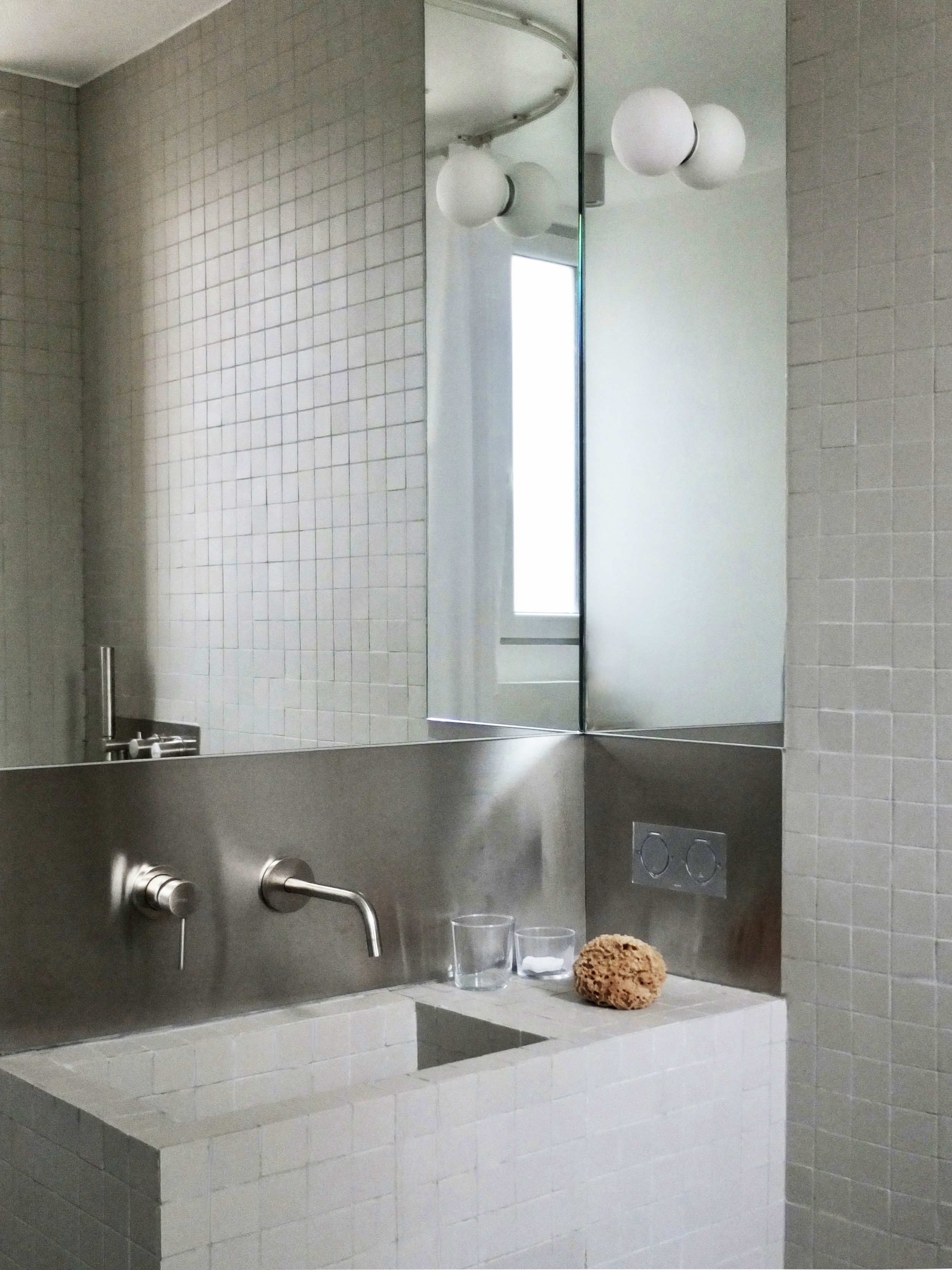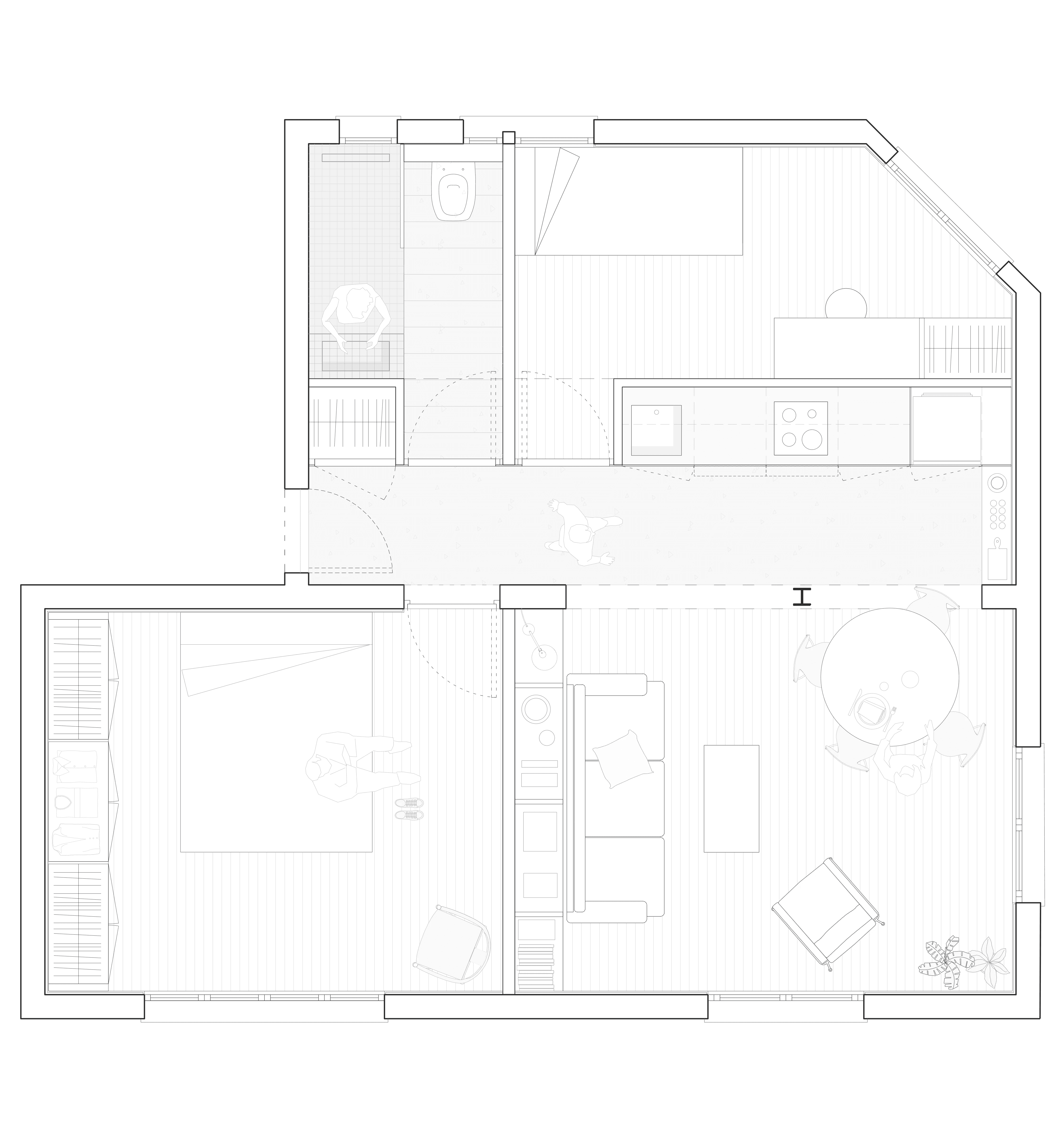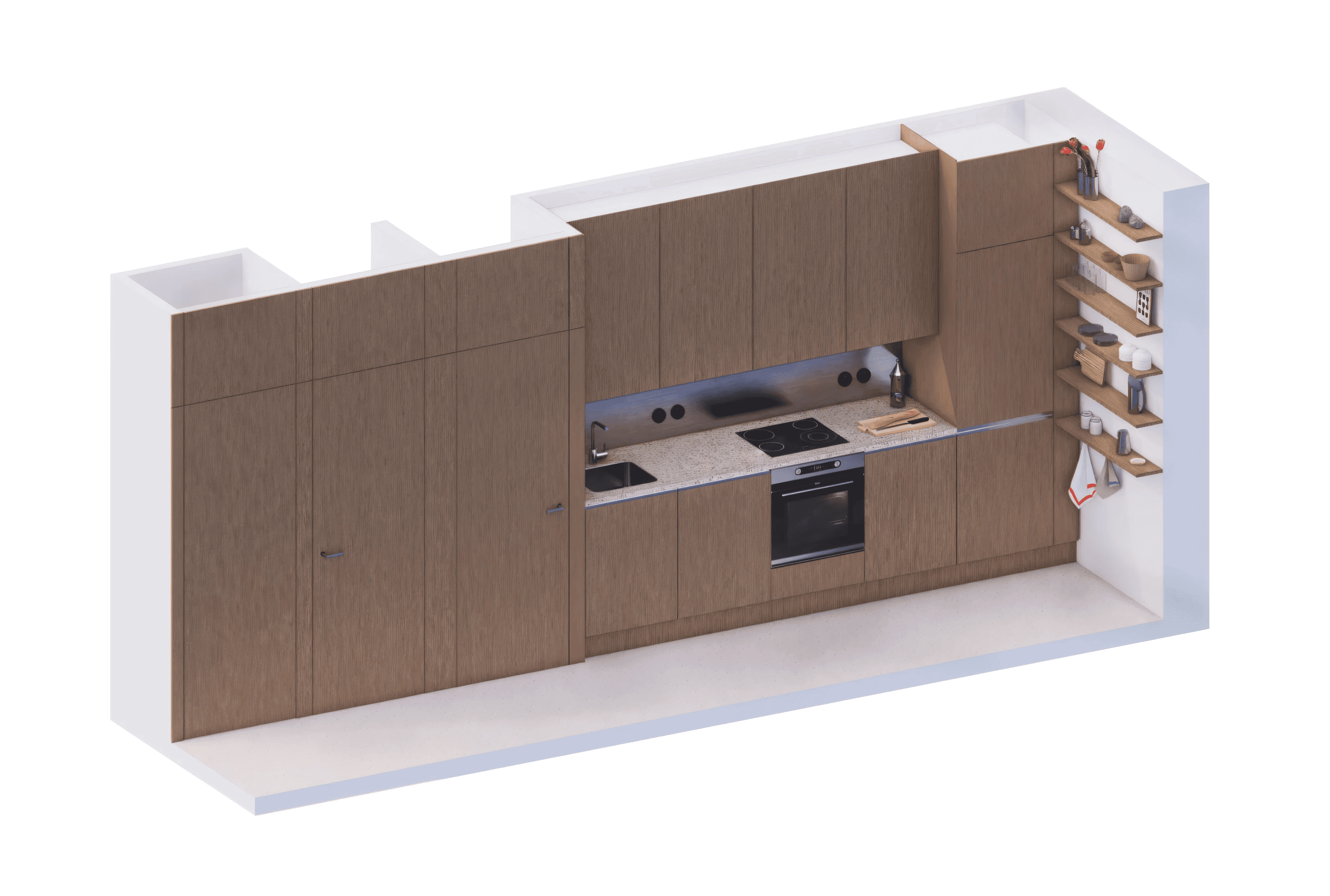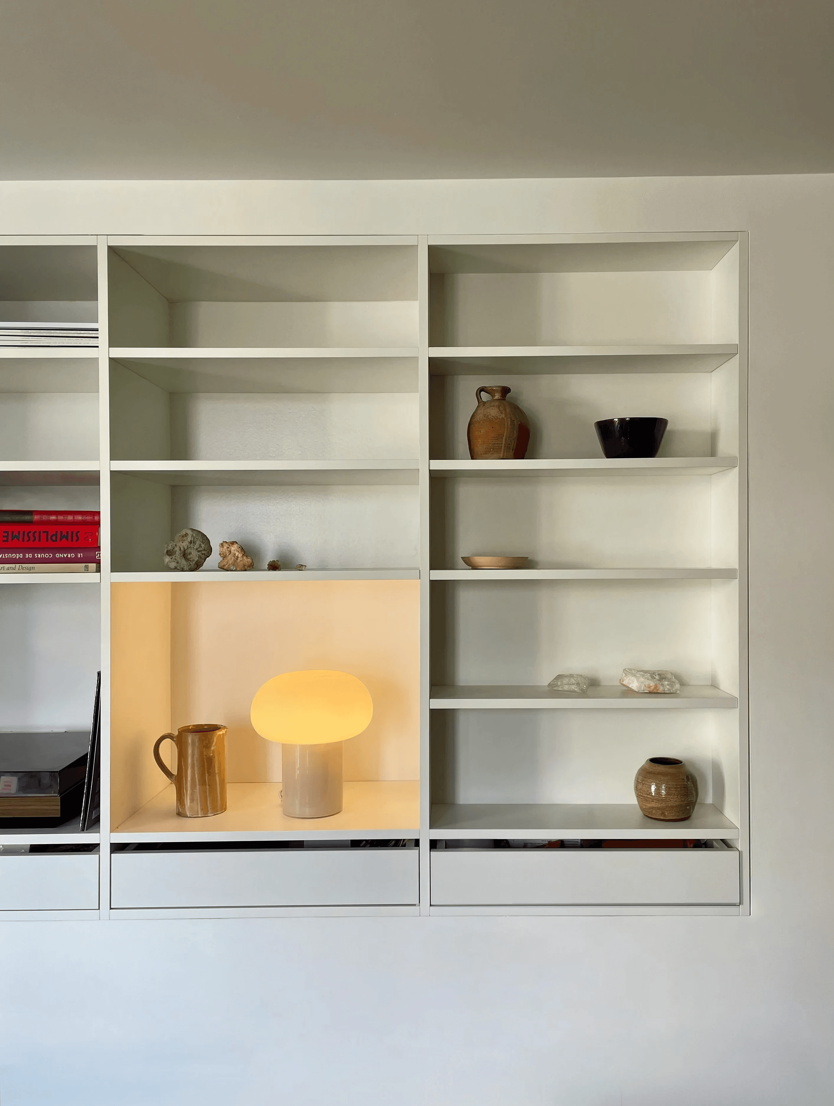 This renovation of an apartment located just outside Paris highlights a minimalist and decidedly contemporary aesthetic. The project focused on rethinking spatial volumes and optimizing functionality, while paying particular attention to materials and natural light. A large custom-made oak unit structures the space while blending seamlessly into the existing architecture. This multifunctional piece integrates an entryway closet, two concealed doors leading to the bathroom, a small office, and an open kitchen — all within a single, continuous element. It offers visual harmony while responding to a variety of everyday needs.